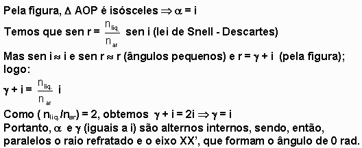c) Se a fonte pontual permanecer em P, considerando-se ainda pequenas incidências, mas um índice de refração do líquido menor que 2, dê a