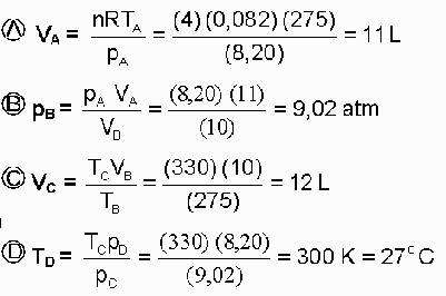 Considere 4 moles de um gás ideal, inicialmente a 2ºC de temperatura e 8,20 atm de pressão, que se submete ao seguinte ciclo de transformações: