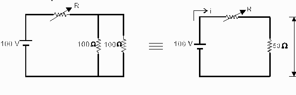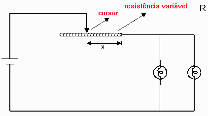 O circuito abaixo pode ser utilizado para controlar a intensidade luminosa de duas lâmpadas. Uma bateria, de f.e.m. igual a 100 V e resistência interna desprezível, alimenta o circuito. As duas lâmpadas são idênticas e de resistência igual a