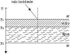 Um raio de luz monocromática atravessa as superfícies de separação entre os meios ar, vidro e água,