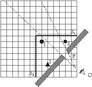 Três objetos 1, 2 e 3 são dispostos à frente dos espelhos planos E1 e E2, conforme mostra a figura.