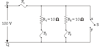 No circuito esquematizado a seguir, F1, F2 e F3 são fusíveis para 20 A, R1 e R2 são resistores e S é uma chave. Estes elementos estão associados a uma bateria que estabelece uma diferença de potencial igual a 100 V entre os pontos P e Q.